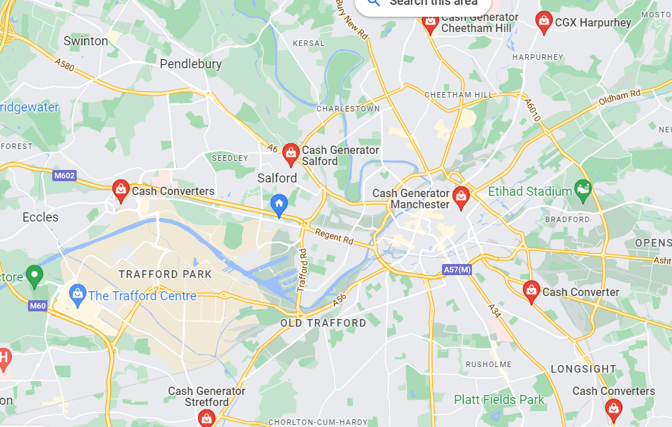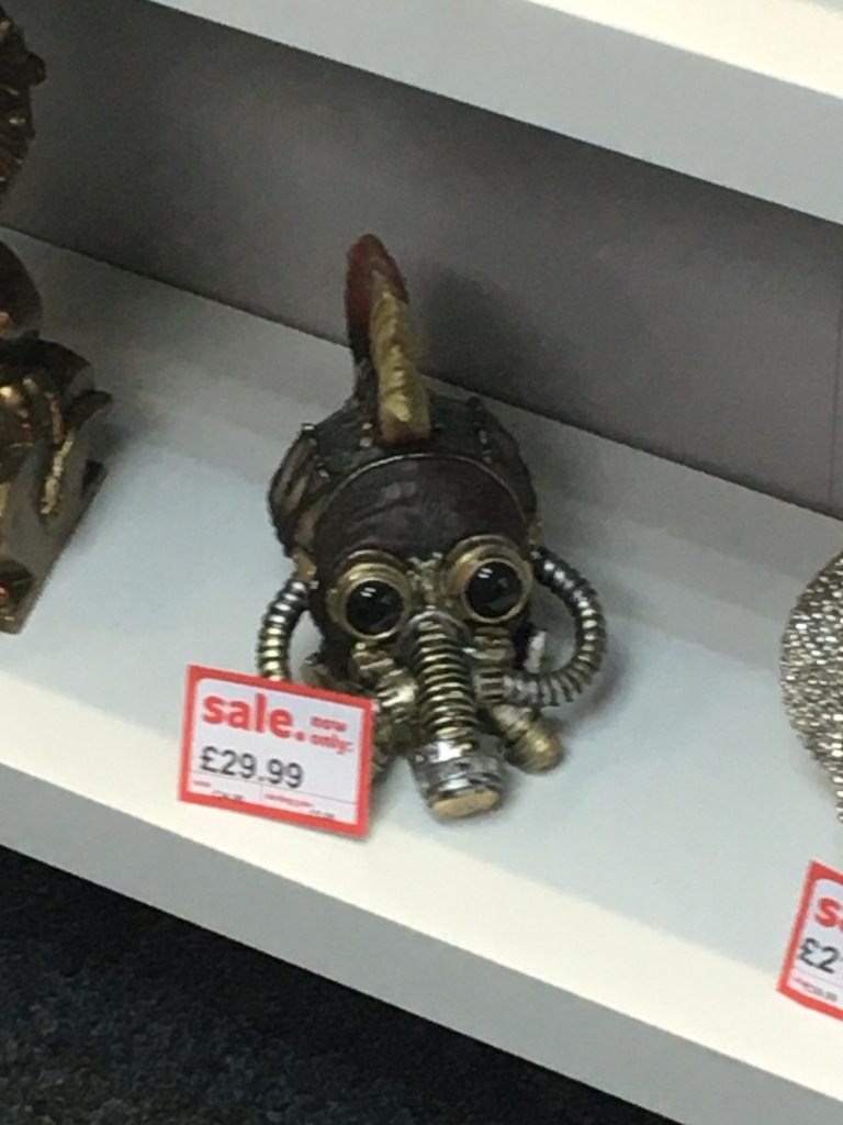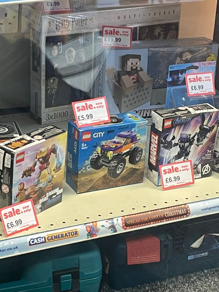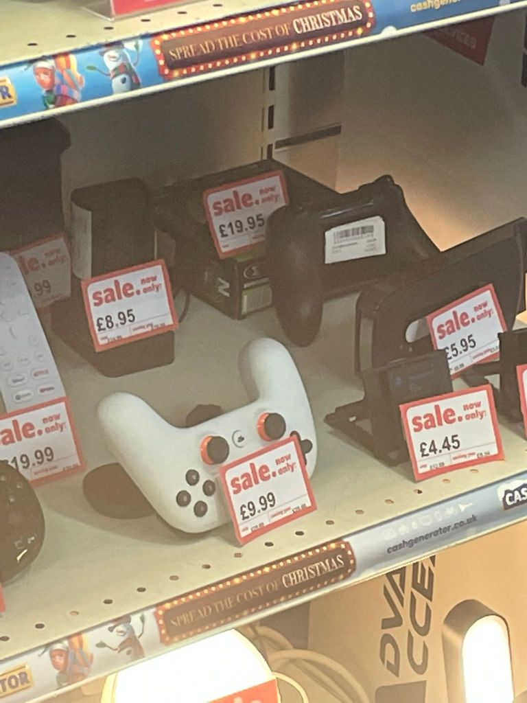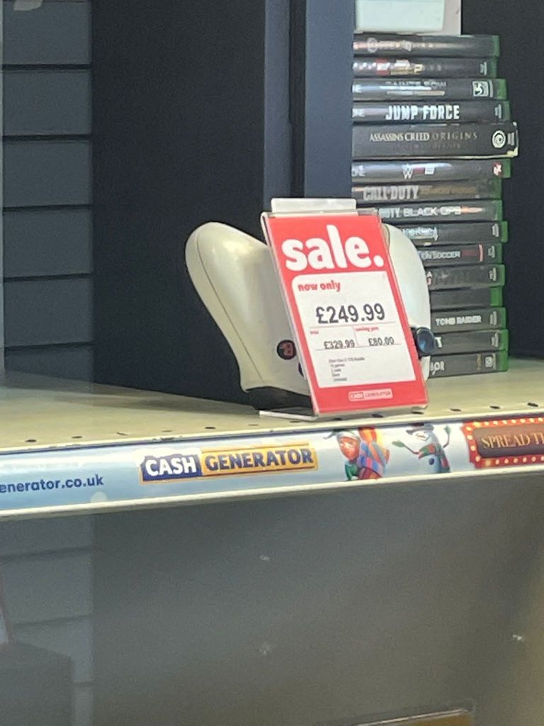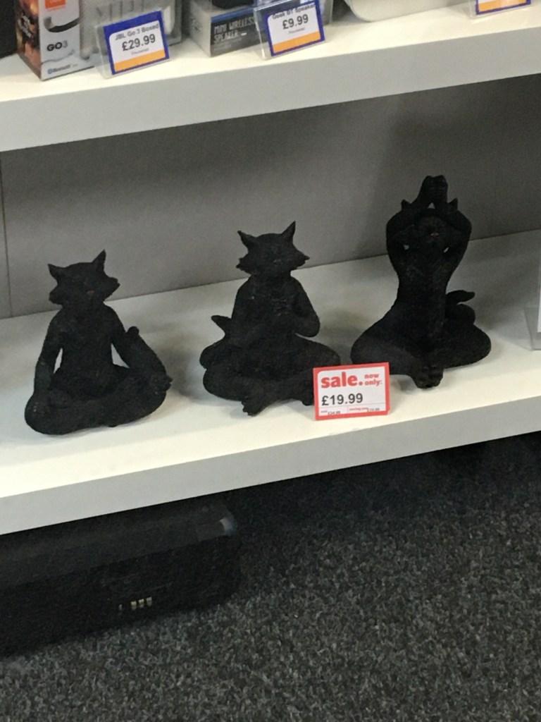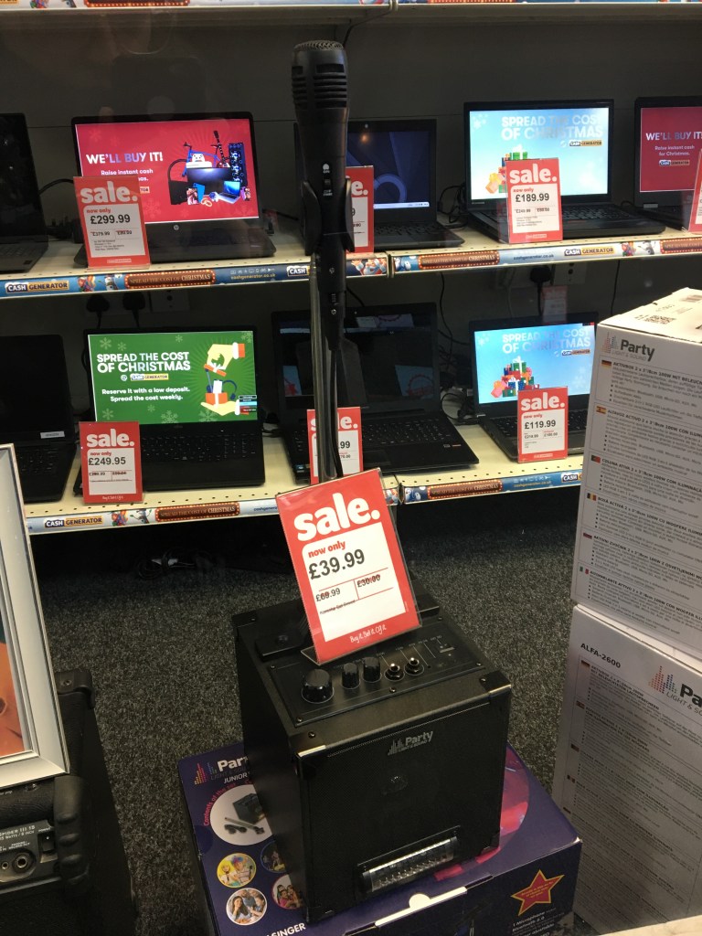 Turns out that there are about as many ‘Cash Generator’s as ‘Cash Converters’s, and that actually, the Cash Generators in Salford and Manchester are more convenient for me, being near my home and also my work. Could have gone to Eccles for a more authentic “Converters” experience, but I had a feeling that these Generator’s would suffice. Although it is a shame to miss out on the affable alliteration as well as the informality and warmth of the grammatically nonsensical plural ‘Converters’.I decided on the one in Salford Shopping Centre. I actually forgot to take a picture of the store when I was there so this is it on Google Street View.The first thing that caught my eye was this Xbox remote. Why was it upside down? They had some Lego sets too. I don’t remember ever having seen Lego in a Cash Converters before, or a Cash Generator for that matter. I used to play with Lego a lot so this was exciting. I thought about how this is around the price that you would get sets of this size for brand new back in the early 2000s, and how expensive sets have gotten since then. I also thought about how the staff at Cash Generator would make sure that all the pieces were included before they accepted it to sell. From when I played with Lego, I knew that some sets would have an inventory of all the pieces in the back of the instructions, but even if these small sets did have that, that would take a long time to audit. They may as well build the sets to check instead. That would be a really great shift I bet. But I figure they probably didn’t check or build it.Some weird kinda yoga type cat ornaments. When I first saw them, I thought they were of that proverb ‘See No Evil, Hear No Evil, Speak No Evil’ that you see of monkeys sold as tat – but these were not doing the corresponding poses, and they are cats. I don’t know enough about yoga to know what the proverb for this would be, or if it makes sense that they are black cats, or if this is even yoga. Also interesting that the meme that black cats always photograph as a void works even when they aren’t real black cats.More upside-down controllers – so I was forced to engage with the phenomenon. As I thought about it, I realised that this way they would rest on the triggers, so would stand up by themselves. Your other options would be laying them so the D-pads faced upwards, which wouldn’t look as good customer-facing; or to lean them against something, which would involve tying to balance them – time consuming! ; or to get stands, which would be a bit of a waste of money. So really this strange upside-down-ness is a fairly optimised way of displaying them. I wondered if this was standard across the buy-and-sell store sector, or if it was one of those neat hacks that a worker comes up with because of the sheer amount of time spent around the products they sell, which then becomes an ubiquitous bit of best practice.A karaoke set. Curious mic stand which seems to be attached to the amp thing. I imagined having to sing into it like that and how much it would affect your karaoke performance. Not to mention you’d be stood basically on top of the little amp thing. Of course you could take it off the stand, but then it seems insane to have such an audacious stand when it’s got such a limited use. Anyway they had two of these.The other one. Did the same person bring them in? If so, why did they have two in the first place? If not, how are they so common?Twin silver Santas. I don’t think they are for sale, just for Christmas. Is there two of everything in this Cash Generator? Like a high-street Noah’s Ark?A skeleton hand-heart thing that says Love Never Dies. There was lots of what I would term Weird Goth Shit on this bottom shelf next to the yoga cats. Kinda Jack-Skellington-core type stuff.Dragon ornament. These are so nostalgic to me because I had a friend as a kid whose whole family were super into dragons and fantasy and shit, and had all posters and ornaments in this kind of magicky, hyper-detailed, illustrated style. There’s something about this kind of heavy-metal-album-cover/fantasy style which has always given me the ick and I can’t put my finger on why.Kinda steampunk helmet ornament thing. Presumably also from this archetypal fantasy-goth type figure who’s selling all their tat to Cash Generator Salford Shopping Centre. Really building a picture of this person in my head, and they might not even exist.One more from their shelf. I like the novelty of this ornament, and I like that our seller has (had) a sense of humour in their ornament collection even if it’s still a bit cringe. More upside down controller, but what’s this – there’s a right-way-up one stood in the shadows. I can’t tell if its on a transparent stand or leaning against the box behind it but in any case, it starts to break the narratives I’d started constructing about the presentation of console controllers in this branch of Cash Generators. One final twist in the tale – this solitary right-way-up controller is also, bewilderingly, back-to-front.My heart leapt when I was at the till and I saw there was a dog in the backroom. I thought at first that it was strange he was here. I’d love to work somewhere that had a pet. Like a strange parallel universe version of the sought after Pub-Cat; the Cash-Generator-Dog. I also felt a bit sorry for him, but I saw he did have some chew toys on the floor in there, and he was wagging his tail every time one of the guys went into the backroom. What a life.Me with the telly I got. I didn’t take pics of the telly I was looking at because as you can see, there was a lot more interesting stuff in the shop. The guy said there wouldn’t be a bag big enough for the telly, so he just wrapped it in this black wrap stuff.