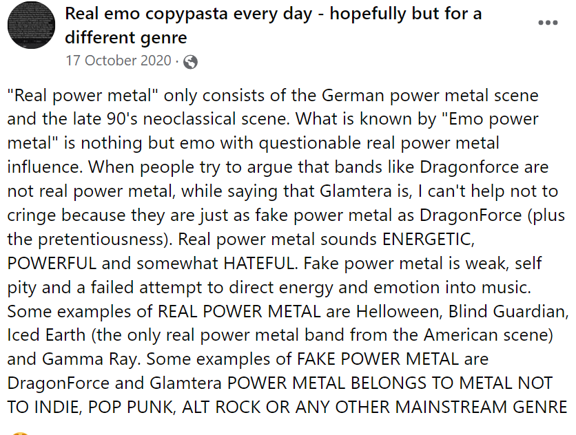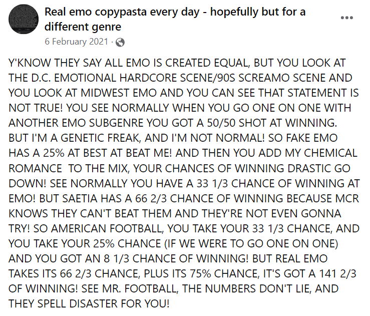 The above is a copypasta* of uncertain origin, circulated and referenced in informal online discussions of emo music from around the mid-2010s onwards. It takes the voice of a kind of online poster type character with a distaste for what they view as ‘fake emo’ and they attempt to articulate the parameters for ‘Real Emo’. Though obviously ironic and not intended to reflect actual opinion around muddy history and arbitrary genre boundaries, it’s not uncommon to see attitudes echoing those in the copypasta defended as fact. Below is a wonderfully 2010-YouTube-core example that almost certainly pre-dates the copypasta, but which outlines some of the positions which are being ridiculed by it. (see more of these positions in the comments below the video)