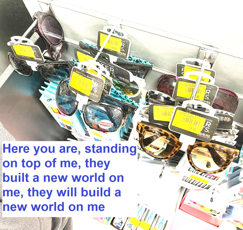 Pictures taken from a root around the shops for sunglasses (which was ultimately successful, but that’s for another day), with words taken from Black Country, New Road (1, 3), Black Midi, (2), Alison Rumfitt (4, 6) and William Blake (5).